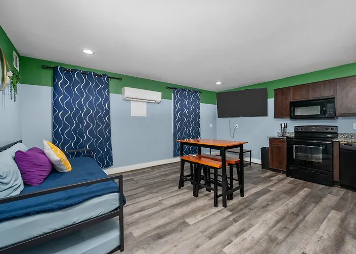 Guests can unwind in sophisticated accommodations that blend contemporary design with home-like comfort. Each room in the Stylish Med Center Getaway With Parking Apartment is thoughtfully appointed, featuring stylish furnishings and amenities to cater to both short and extended stays. With expansive living spaces, guests can enjoy a perfect balance of relaxation and productivity during their visit.